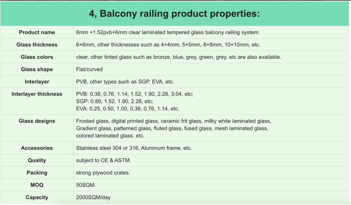 Usually will be described as 6mm clear tempered+1.52PVB+6mm clear tempered laminated glass balcony railing.